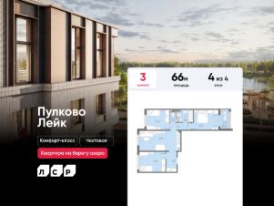 Продается 3-комнатная квартира в ЖК "Пулково Лейк" на 4 этаже. Общая площадь составляет 66.00 кв. м. Квартира с чистовой отделкой. Жилой комплекс "Пулково Лейк" располагается по адресу Санкт-Петербург, Московский.