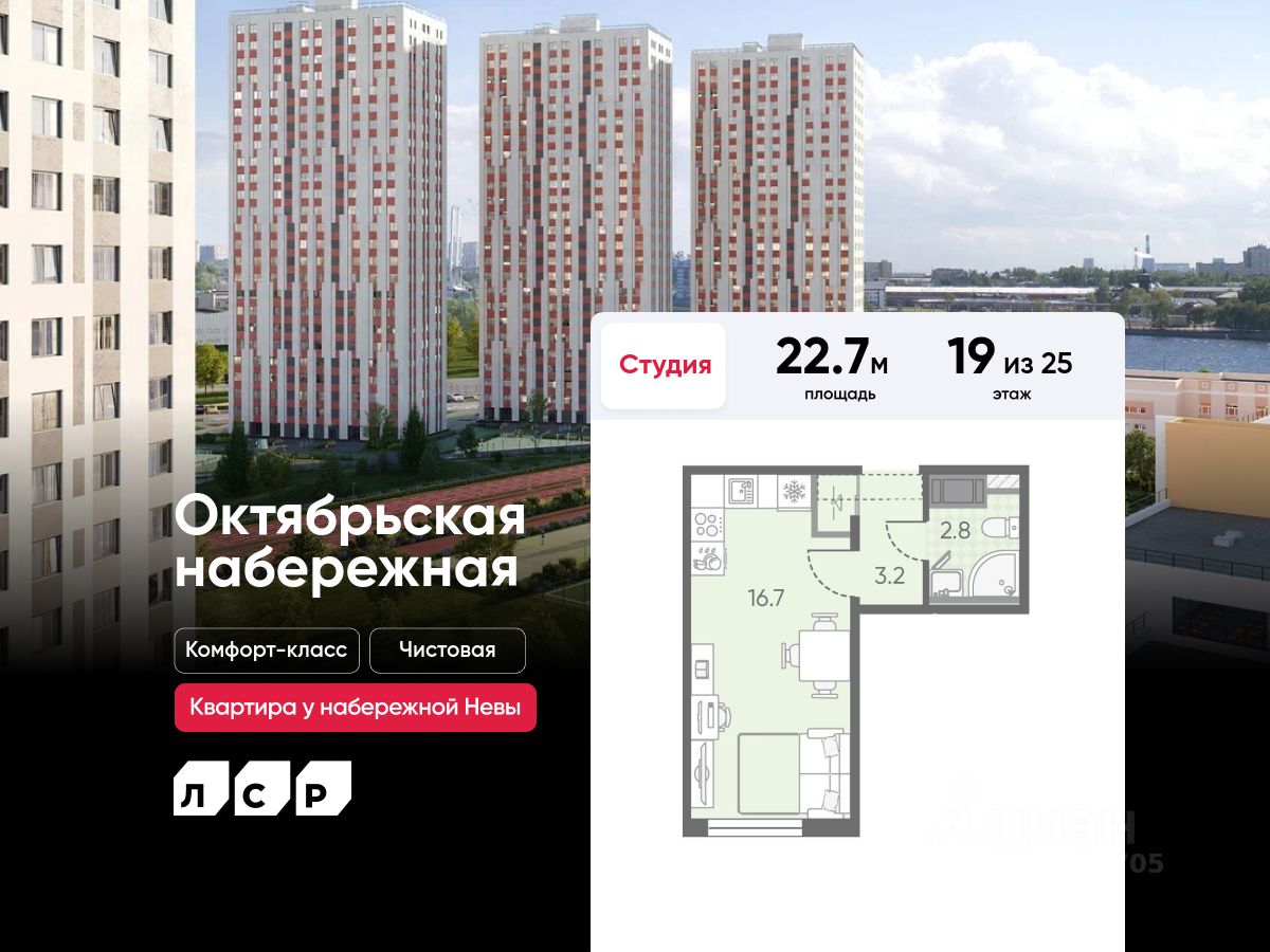 Продается студия в ЖК "Октябрьская набережная" на 19 этаже. Общая площадь составляет 22.70 кв. м. Квартира с чистовой отделкой . Жилой комплекс "Октябрьская набережная" располагается по адресу Санкт-Петербург, Невский.