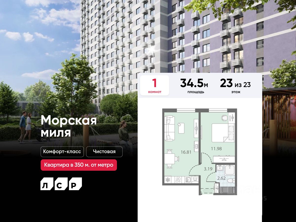 Цена действует при 100% оплате и на определенные ипотечные программы. Подробности — в отделе продаж по телефону. Продается 1-комнатная квартира в ЖК "Морская миля" на 23 этаже. Общая площадь составляет 34.50 кв. м. Квартира с чистовой отделкой. Жилой комплекс "Морская миля" располагается по адресу Санкт-Петербург, Красносельский. Морская миля - жилой комплекс в Красносельском районе Санкт-Петербурга. Расположение комплекса - его главное преимущество: близость к таким историческим памятникам и местам, как Петергоф, Павловский дворец и Царское село позволяет в любой момент насладиться красотами культурной столицы России. Расположение: - всего 350 м до новой станции метро "Юго-Западная"; - 20 минут до Петергофа на автомобиле; - 20 минут до аэропорта "Пулково" на автомобиле; - 30 минут до Царского села на автомобиле. Между корпусами расположены спортивные и детские площадки, пешеходный бульвар. В квартире выполнена полная отделка "Comfort Wood" из качественных материалов: прочный ламинат цвета благородного дуба, фактурные белые обои, керамическая плитка в ванной. Вход в парадные расположен на уровне земли и создает доступную среду для пожилых людей, людей с ограниченными возможностями и мам с колясками. На этажах и в подвале есть кладовые, которые позволят освободить пространство квартиры от лишних вещей. Первые этажи отведены под магазины и колясочные. На территории комплекса находятся наземные паркинги, гостевые парковки, детский сад, школа. В пешей доступности расположены магазины, кафе, аптеки и прочие удобства, необходимые для спокойной и комфортной жизни. Во дворах устроены пешеходные зоны, дворы озеленены и благоустроены: имеются тенистые аллеи, уютные зоны для отдыха детей и взрослых, а также стильные плей-хабы. Преимущества: - Станция метро в пешей доступности - Пешеходный бульвар - Близость к памятникам культуры и архитектуры - Школа и детский сад во дворе - Доступная среда Успейте приобрести квартиру на выгодных условиях! Чтобы узнать подробности, обращайтесь за консультацией по телефону.