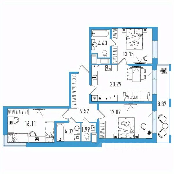 Квартиры с угловым остеклением, двумя большими ванными и дополнительным окном в рабочей зоне кухни.