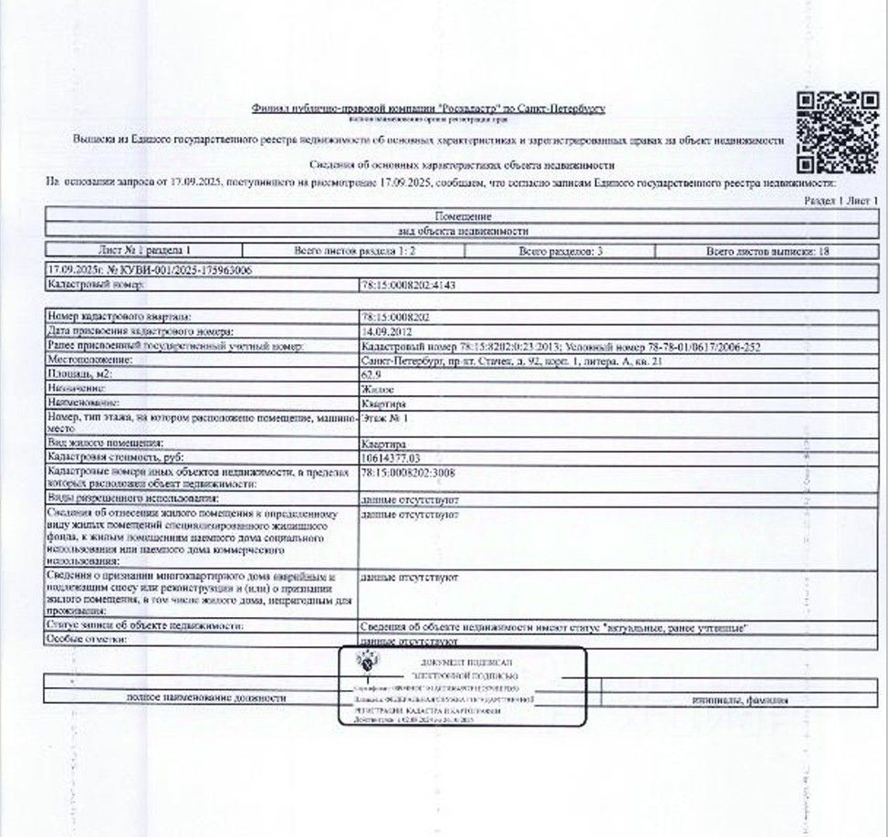 квартира по адресу: г. Санкт-Петербург, пр. Стачек, д.92, корп.1, лит.А, кв.21, общ. пл. 62.9 кв.м., кадастровый номер 78:15:0008202:4143