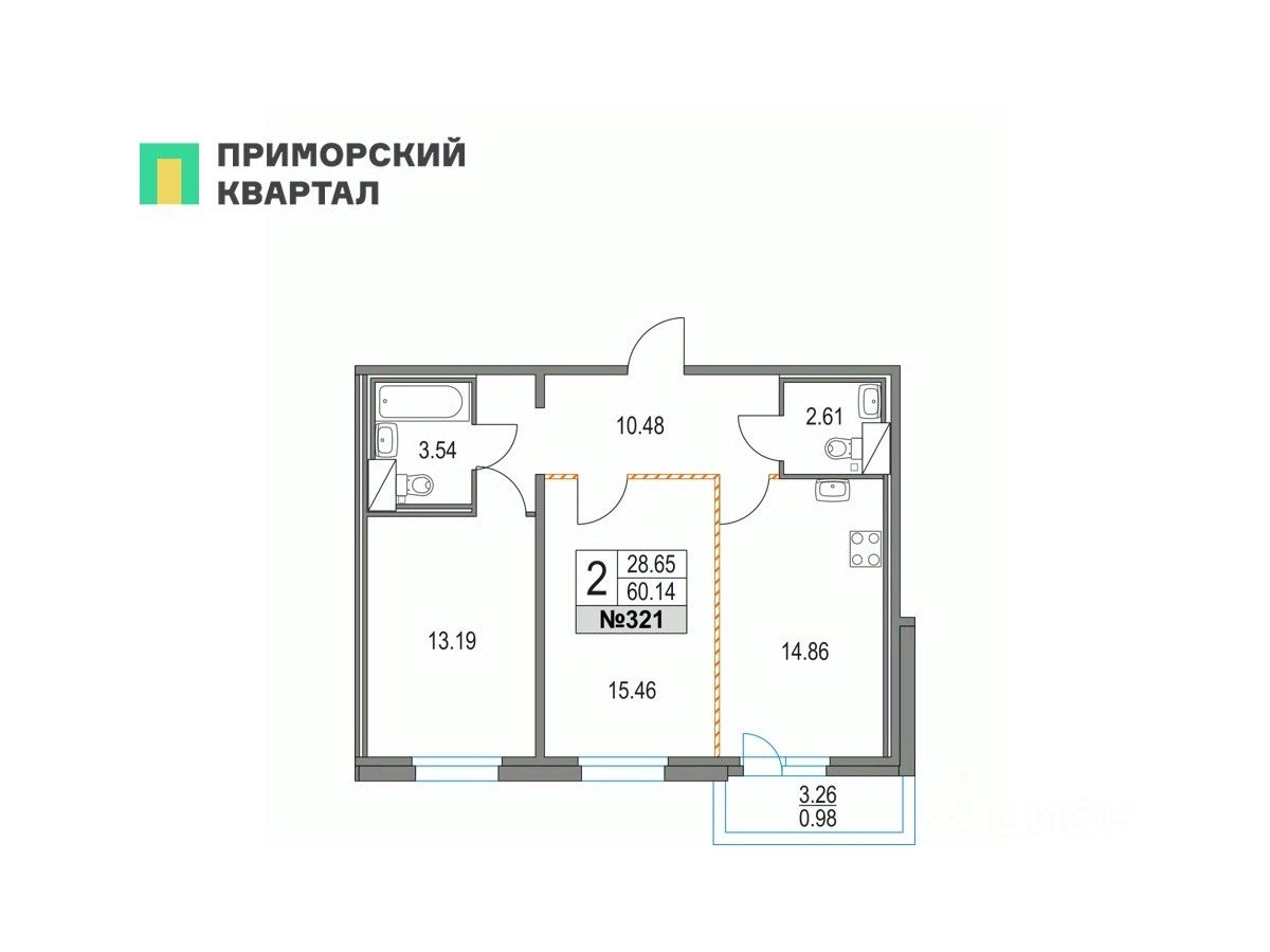 Продается 2 - комнатная квартира общей площадью 60.14 кв.м., на 3 этаже в построенном и заселенном корпусе 42 (год сдачи: 2024 г.)