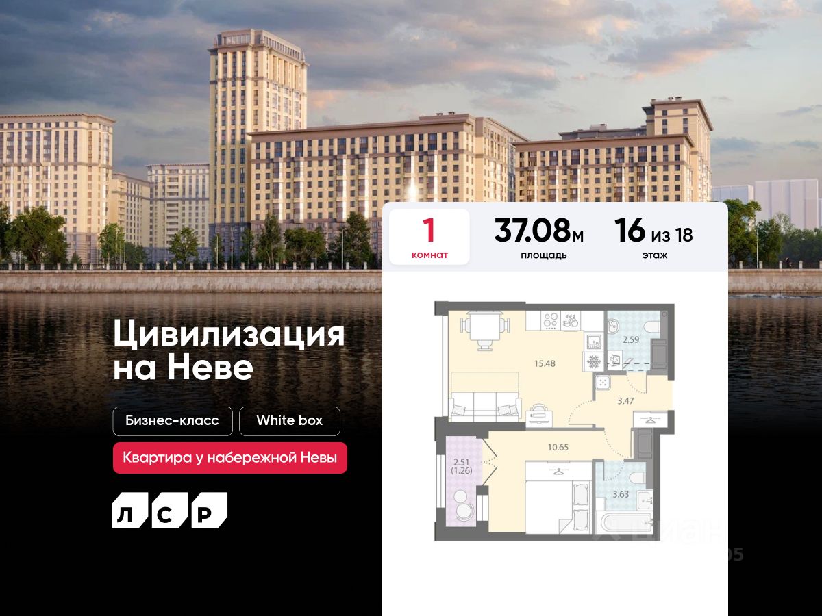 Продаётся 1-комнатная квартира в ЖК "Цивилизация на Неве" на 16 этаже. Общая площадь составляет 37.08 кв. м. Квартира с white box отделкой. Жилой комплекс "Цивилизация на Неве" располагается по адресу Санкт-Петербург, Невский.