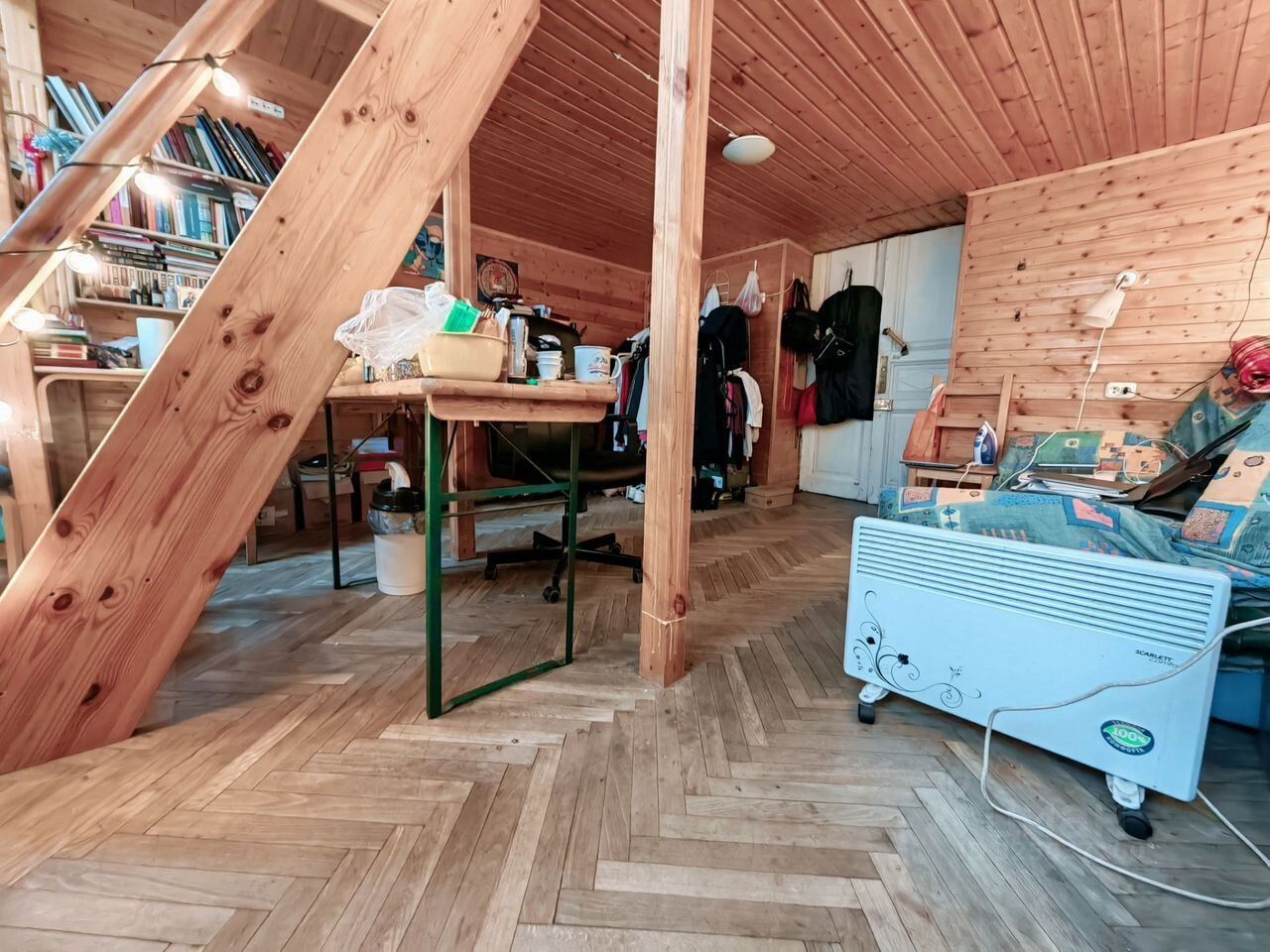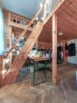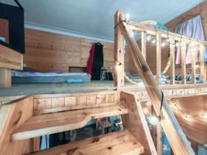 - Комната имеет форму практически идеального квадрата. Благодаря высокому потолку оборудован второй уровень. На первом уровне гостиная, на втором-спальная зона. Комната светлая благодаря двум окнам. Обшита деревом. Имеется встроенная система хранения.