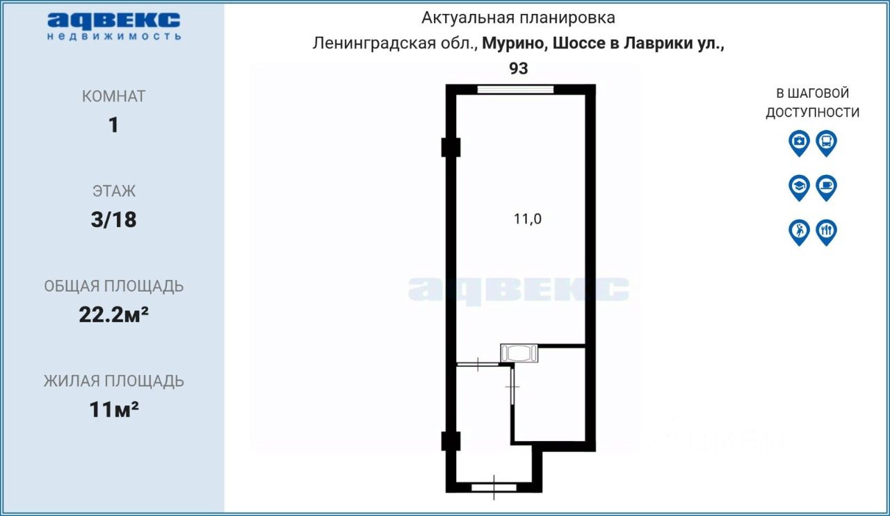 Площадь квартиры составляет 22,2 кв.м, расположена она на 3-м этаже 18-этажного здания. Планировка представляет собой студию с совмещенным санузлом. В квартире отсутствует ремонт, что позволяет организовать пространство по своему вкусу. Окна выходят на улицу, благодаря чему естественное освещение поступает в жилое помещение.