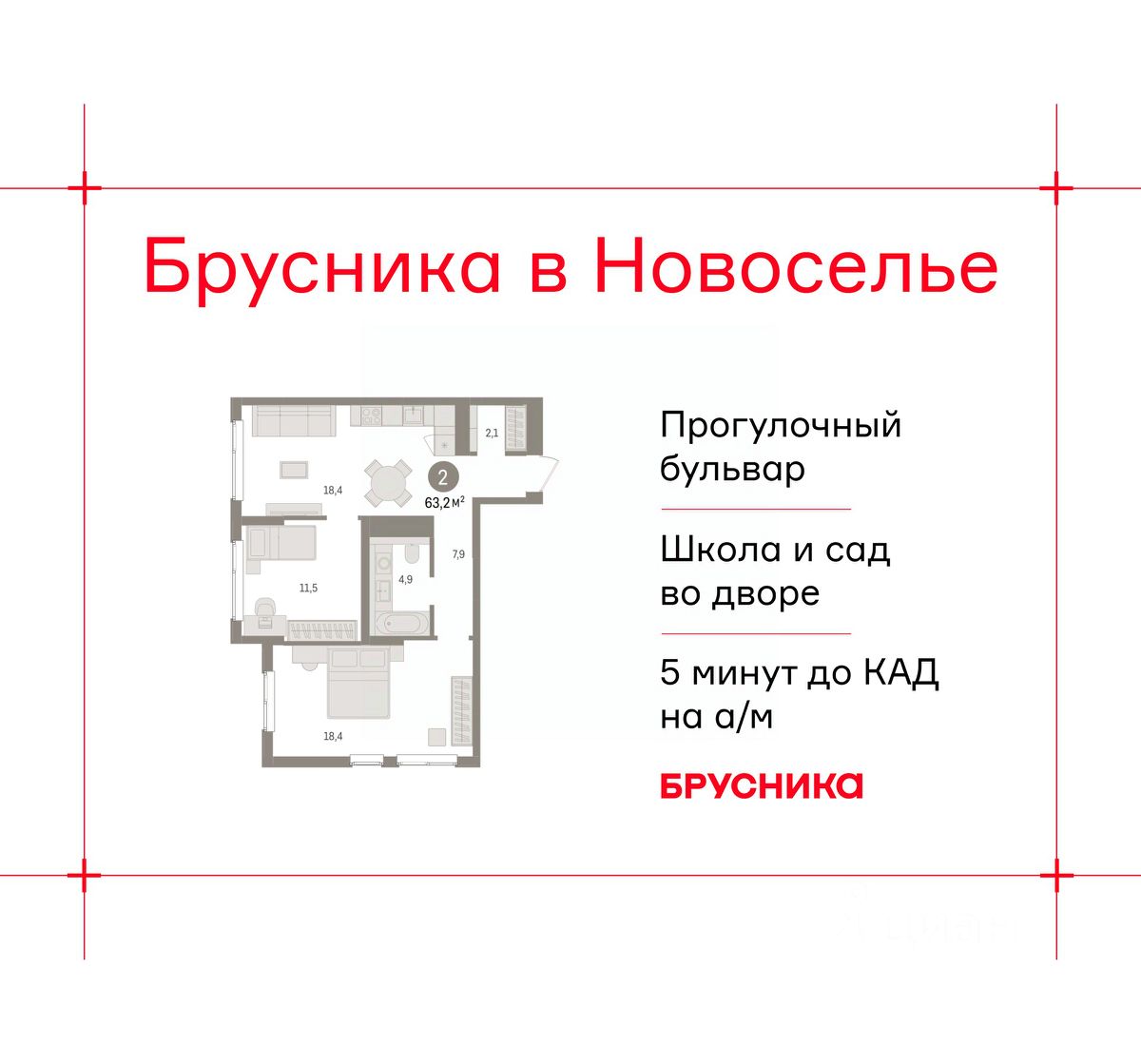 Просторная двухкомнатная квартира с предчистовой отделкой в ЖК "Брусника в Новоселье" на 2 этаже. Общая площадь: 63.23 кв.м., жилая: 29.9 кв.м., площадь просторной кухни-столовой: 18.4 кв.м. Квартира угловая, окна oбecпeчивaют paвнoмepнoe ocвeщeниe в тeчeниe дня. В квартире один совмещенный санузел. Высота потолков 2.7 м.