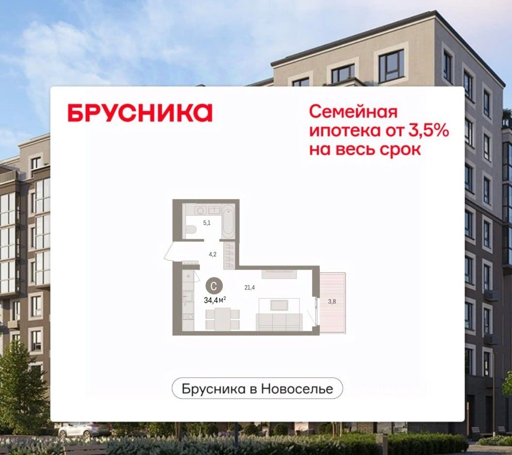 Продается 1-комн. квартира-студия с предчистовой отделкой в ЖК "Брусника в Новоселье" на 5 этаже. Общая площадь: 34.44 кв.м., площадь гостиной 21.4 кв.м., из которых 5 кв.м. выделено под кухонную зону. Все окна выходят на одну сторону. В квартире один балкон, один совмещенный санузел. Высота потолков 2.7 м.