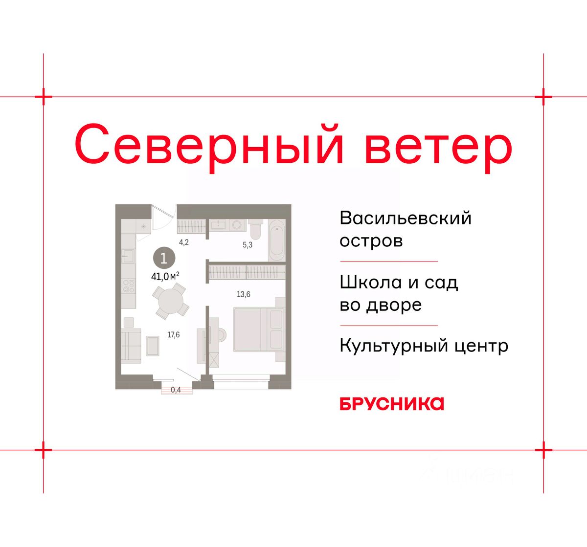 Продается 1-комн. квартира с предчистовой отделкой в ЖК "Северный ветер" на 9 этаже. Общая площадь: 41.04 кв.м., жилая: 13.6 кв.м., площадь просторной кухни-столовой: 17.6 кв.м. Все окна выходят на одну сторону. В квартире один совмещенный санузел. Высота потолков 2.72 м.