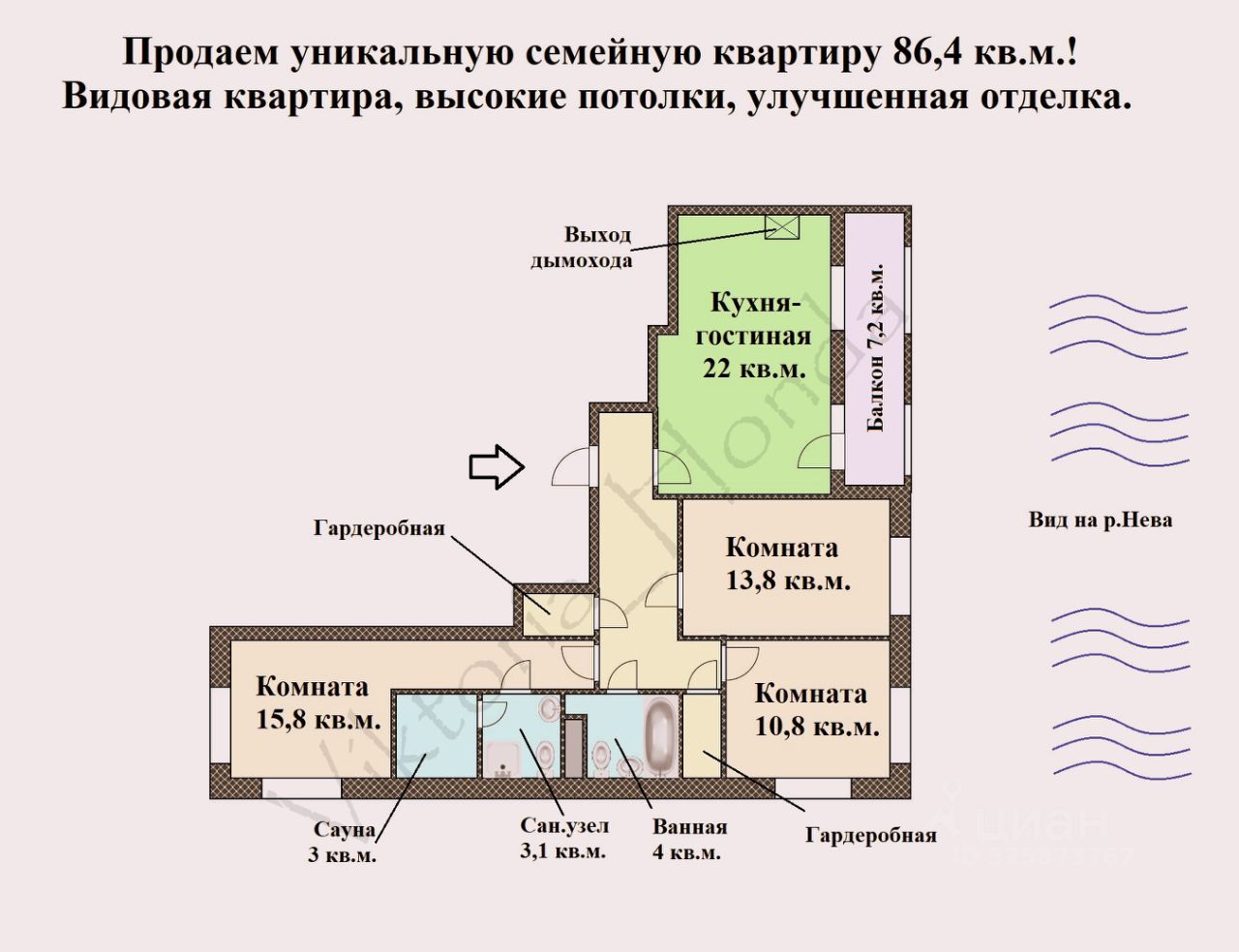 + Уникальная квартира выводили в продажу под нас: большая кухня гостиная с выходом дымохода для установки камина, изолированные спальни, зоны гардеробных, светлые комнаты с двумя окнами, высокие потолки, выделенное помещение под сауну лучшее предложение на рынке.