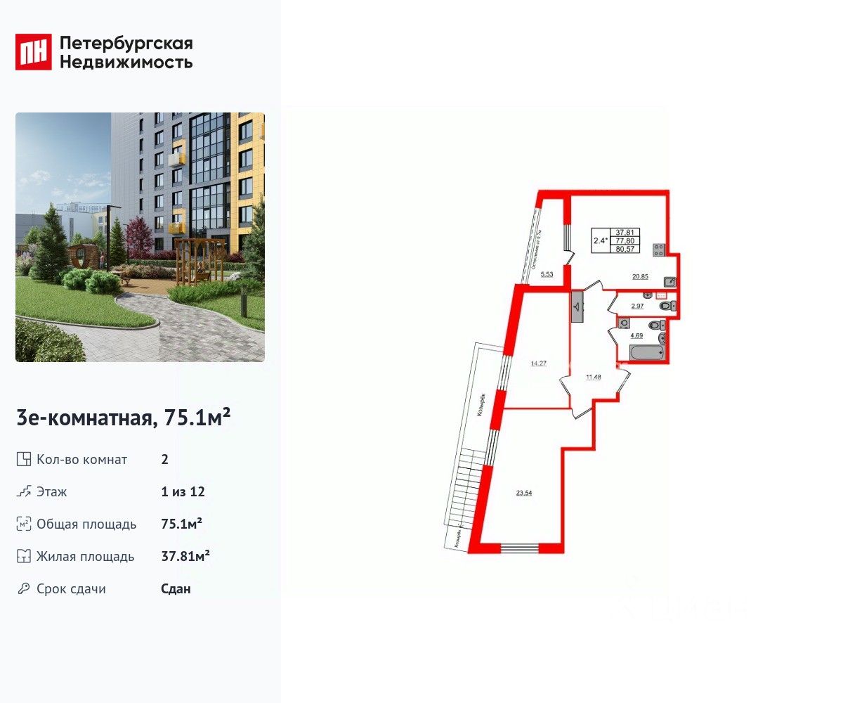 Удобная, классическая, функциональная европланировка, большая кухня-гостиная 20.85 м², просторная прихожая 11.48 м². Общая площадь квартиры - 75.1 м², жилая 37.81 м², высота потолка 2.77 м.