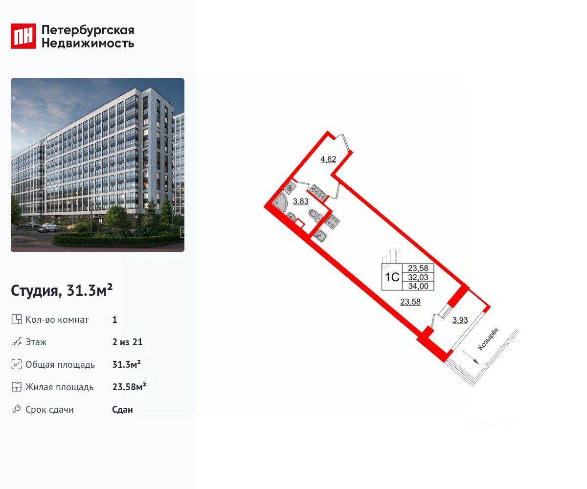 Удобная, классическая, функциональная европланировка, просторная прихожая 4.62 м². Общая площадь студии - 31.3 м², жилая 23.58 м², высота потолка 2.77 м.