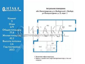 128654274 Продаётся уютная трехкомнатная квартира площадью 77.8 квадратных метров на втором этаже девятиэтажного панельного дома, расположенного по адресу: г.Выборг, Центральный микрорайон, ул.Физкультурная, дом 21 к2. Строение 2013 года обладает современной инфраструктурой: в шаговой доступности находятся школа, детский сад, торговый центр, парк и фитнес-клуб.