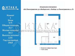 128654539 Продаётся уютная однокомнатная квартира площадью 31.7 квадратных метров на пятом этаже пятиэтажного кирпичного дома, расположенного по адресу: г. Выборг, Центральный микрорайон, Ленинградское шоссе, 31. Жилая площадь составляет 18.3 квадратных метров, кухня 6.4 квадратных метров. Квартира привлекательна своим местом положения, как для небольшой семьи так и для сдачи в аренду. Вся инфраструктура города в шаговой доступности.