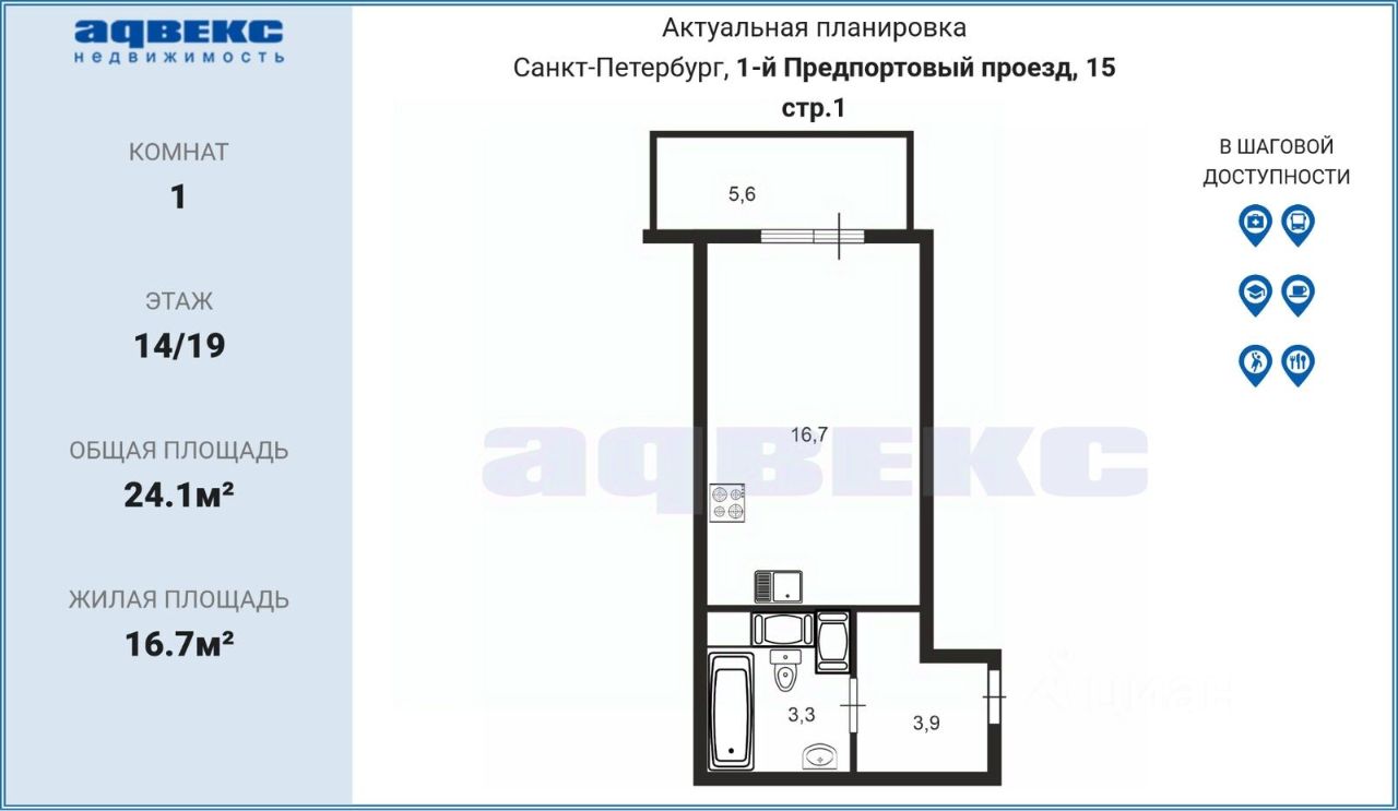 Квартира расположена на 14-м этаже 19-этажного дома.