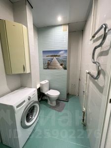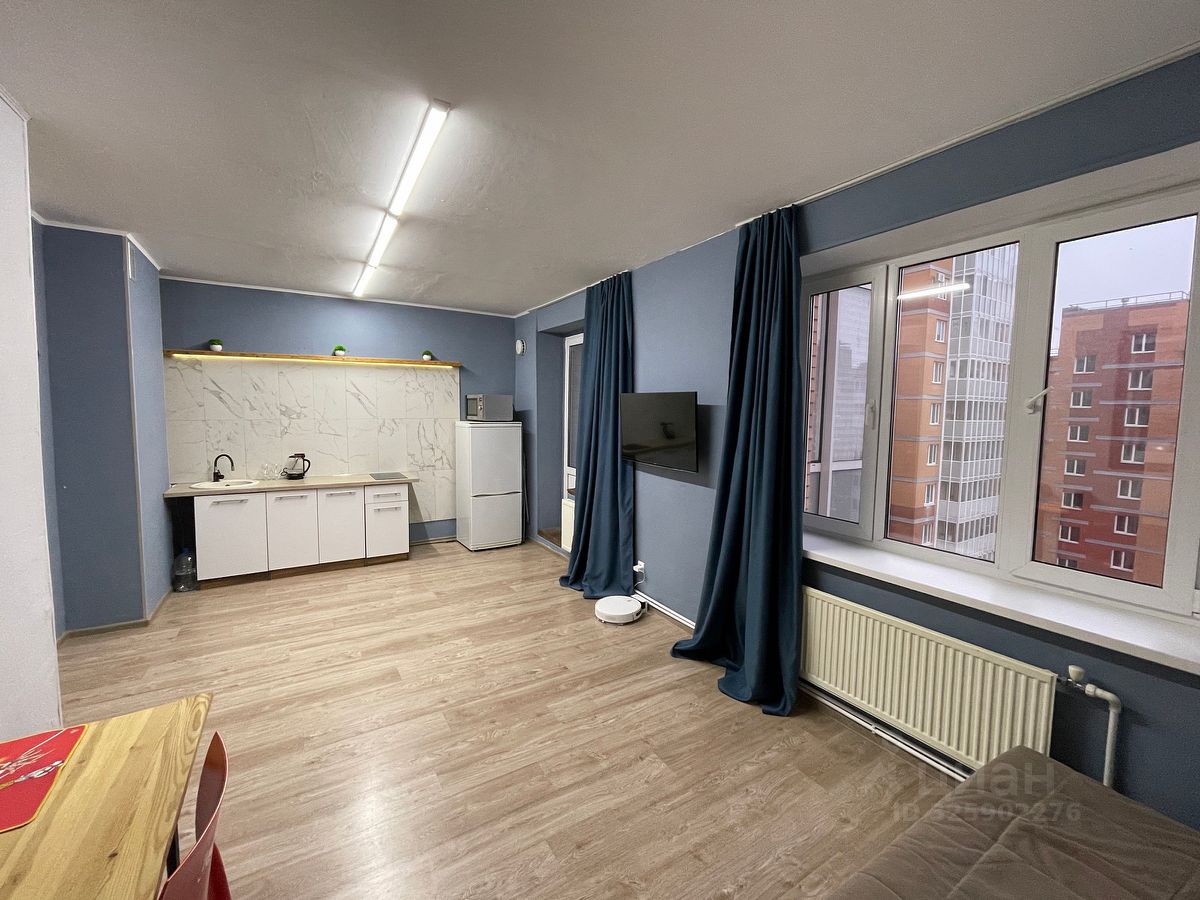 Современная кухня-гостиная с балконом 18 метров, окна выходят во двор, уютная светлая спальня 13 метров, просторный совмещенный санузел.