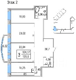 Квартира общей площадью 121,7 кв.м. без учета балкона, три изолированные комнаты 17,04, 15,17, 16.10 кв.м. , кухня гостиная 38,15, имеются два санузла, хозяйственная комната.