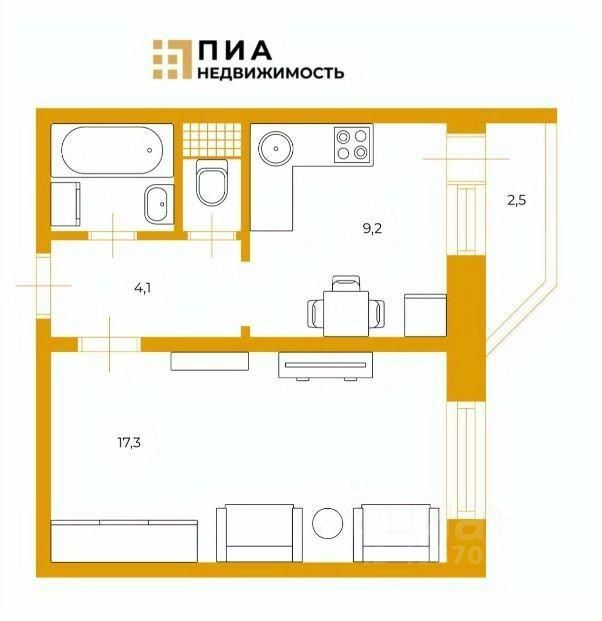 - кухня 9, 2 кв. м с лоджией 2,5 кв. м , комната 17,3 кв. м.;