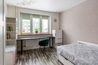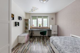 - Две ИЗОЛИРОВАННЫЕ комнаты (спальня 15,2 м² и детская 16 м²) и правильной геометрической формы, (приближенной к квадратной). Детская оборудована просторной светлой рабочей зоной.
