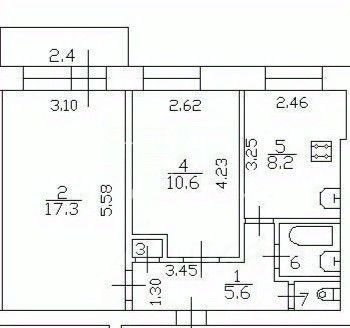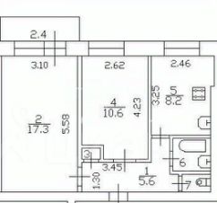 Квартира имеет продуманную планировку с жилой площадью 28 квадратных метров ( комнаты 17,3 10,6) и кухней площадью 8,2 квадратных метров. Также имеется раздельный санузел и балкон, откуда открывается вид на улицу.
