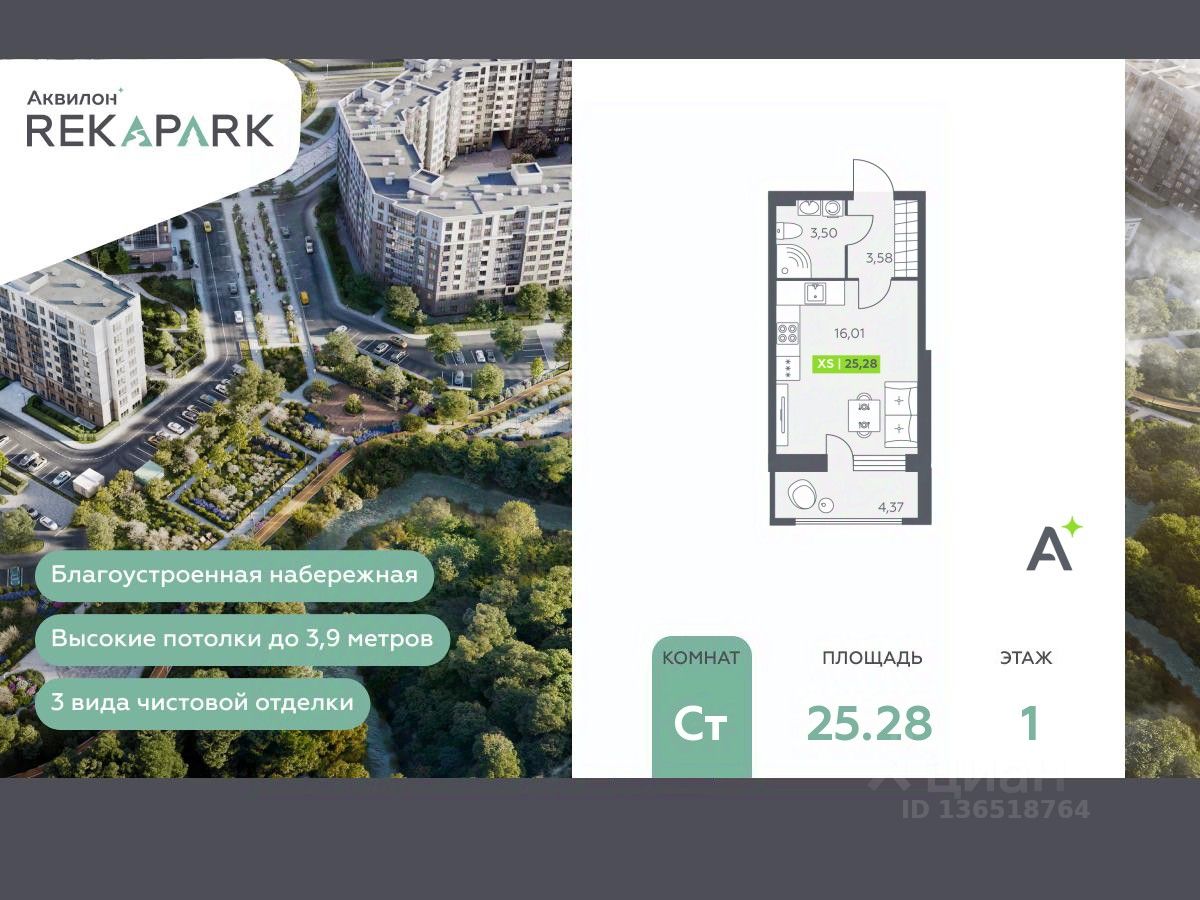 Однокомнатная квартира-студия в ЖК "Аквилон RekaPark" на 1 этаже. Общая площадь: 25.28 кв.м., площадь гостиной 16.01 кв.м., из которых 5 кв.м. выделено под кухонную зону. Все окна выходят на одну сторону. В квартире один балкон, один совмещенный санузел. Высота потолков 2.74 м.