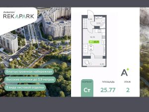 1-комн. квартира-студия от застройщика в ЖК "Аквилон RekaPark" на 2 этаже. Общая площадь: 25.77 кв.м., площадь гостиной 16.45 кв.м., из которых 5 кв.м. выделено под кухонную зону. Все окна выходят на одну сторону. В квартире один балкон, один совмещенный санузел. Высота потолков 2.74 м.