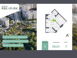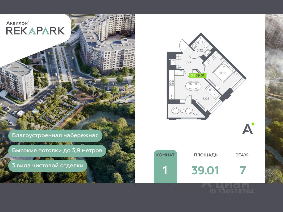 Продается однокомнатная квартира в ЖК "Аквилон RekaPark" на 7 этаже. Общая площадь: 39.01 кв.м., жилая: 11.63 кв.м., площадь просторной кухни-столовой: 16.08 кв.м. Все окна выходят на одну сторону. В квартире одна лоджия, один совмещенный санузел. Высота потолков 2.74 м.