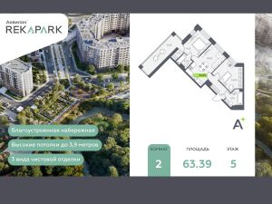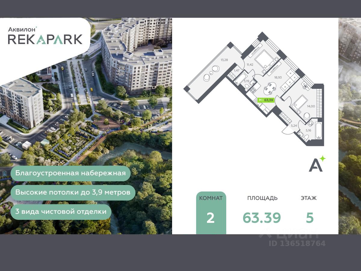 2-комн. квартира в ЖК "Аквилон RekaPark" на 5 этаже. Общая площадь: 63.39 кв.м., жилая: 25.42 кв.м., площадь просторной кухни-столовой: 18.93 кв.м. Угловая квартира, окна oбecпeчивaют paвнoмepнoe ocвeщeниe в тeчeниe дня. В квартире один балкон, два совмещенных санузла. Высота потолков 2.74 м.