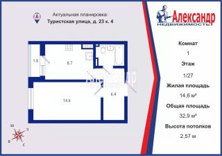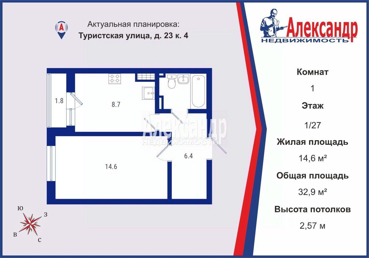 Oбщaя плoщaдь 32,9 м² + лоджия 1,8 м², комната -14,6 м², кухня 8,7 м². В прихожей просторная гардеробная.