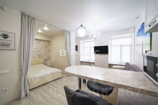 Дизайнерский ремонт, высокие потолки 2,7 метра и большие окна создают атмосферу простора и уюта. Общая площадь квартиры — 32 квадратных метра, из которых 28 квадратных метров — жилая площадь. Кухня занимает 4 квадратных метра.