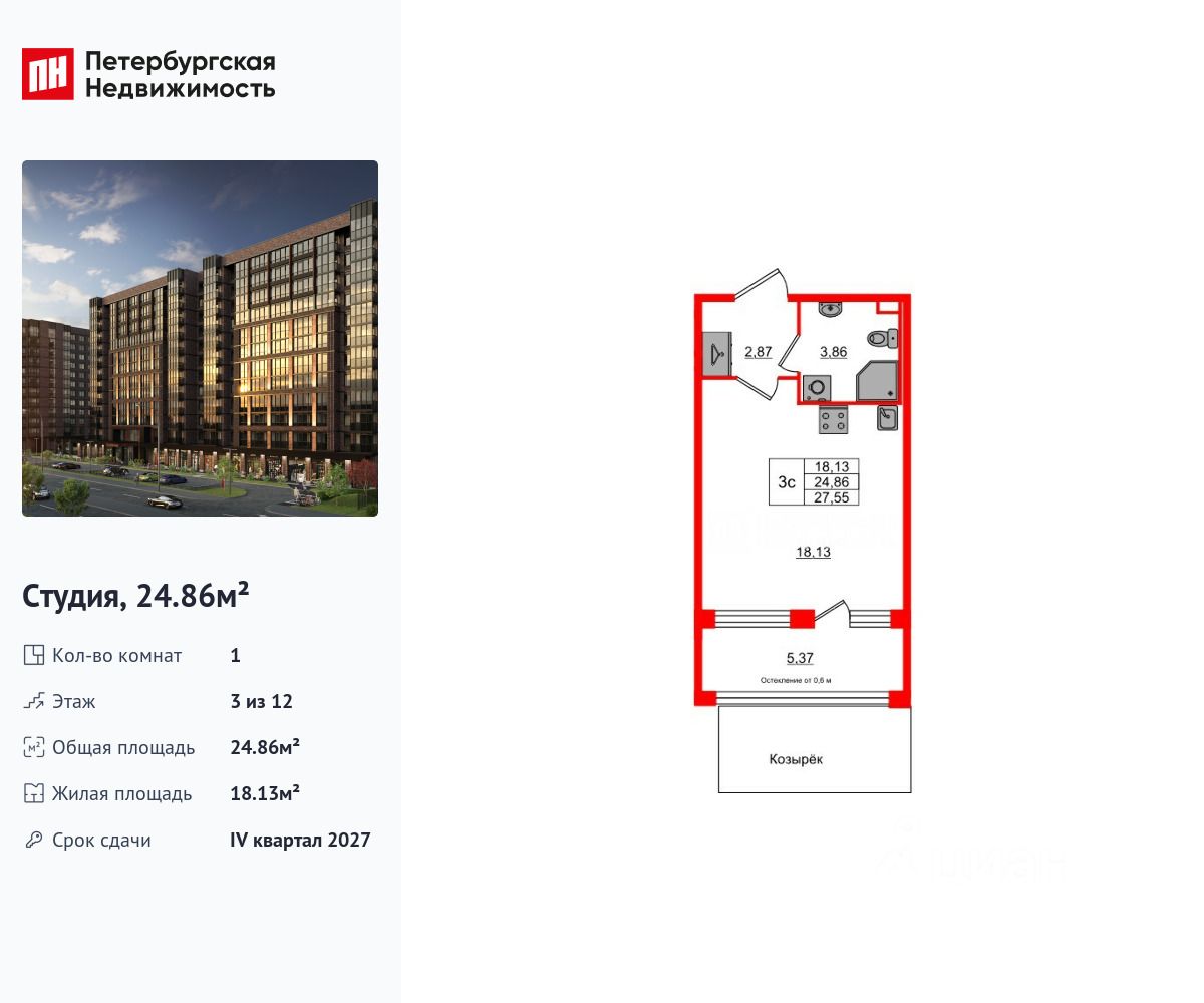 Удобная, классическая, функциональная европланировка, вместительная прихожая 2.87 м². Общая площадь студии - 24.86 м², жилая 18.13 м², высота потолка 2.75 м.