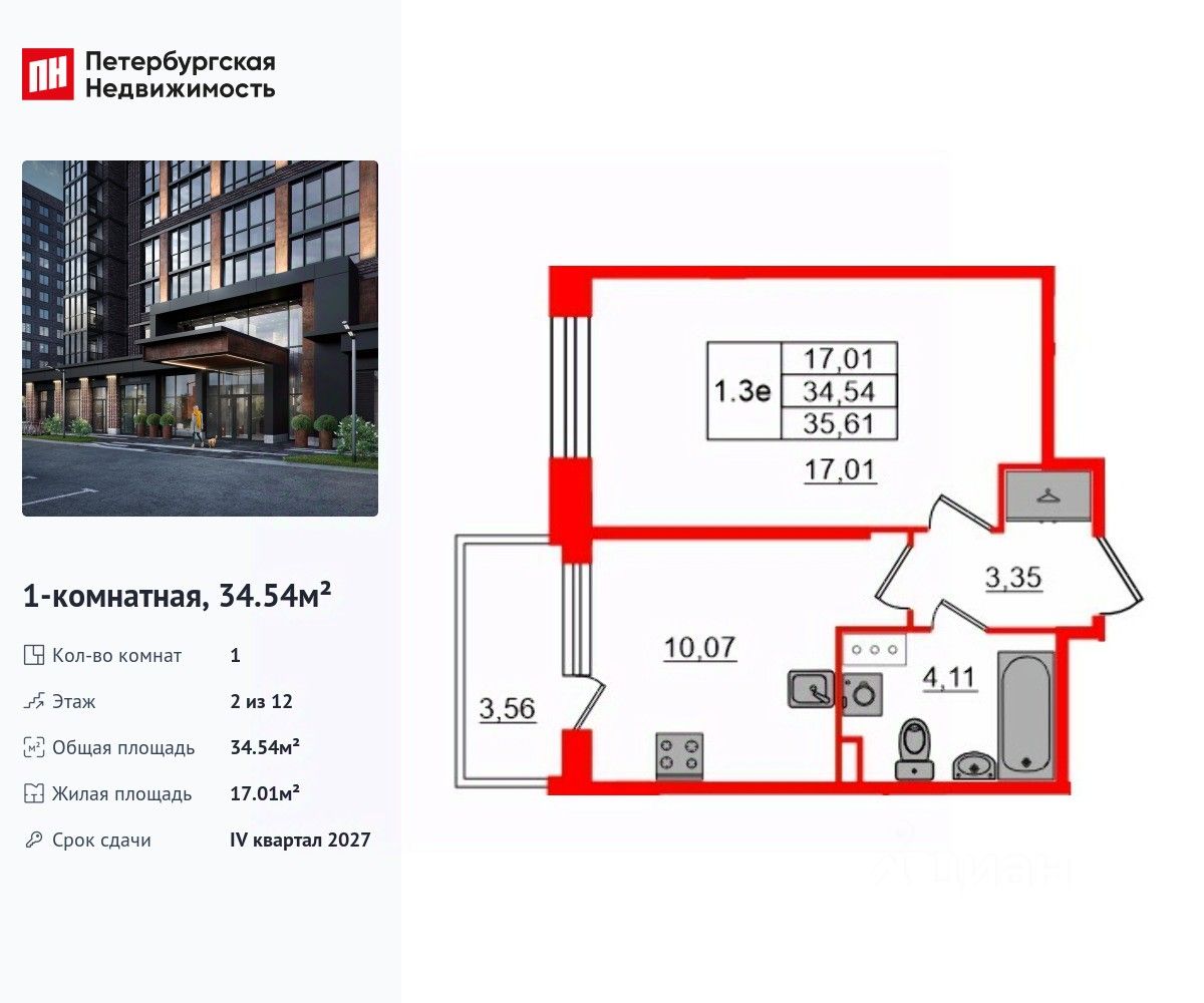 Удобная, классическая планировка, кухня 10.07 м², вместительная прихожая 3.35 м². Общая площадь квартиры - 34.54 м², жилая 17.01 м², высота потолка 2.75 м.