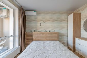Дизайн-проект в эко-стиле. Панорамные окна в кухне и спальне. Оборудованное пространство гардеробной. Площадь кухни позволяет разместить небольшой диван для отдыха. Кондиционер. Застекленная лоджия.