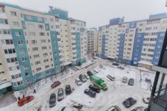 На лоджии тёплый пол и светильник, комфортно в межсезонье. В комнате предполагается большая кровать, напротив экран, по краям тумбочки, широкий шкаф. Есть место и для стола. Люстра на пульте управления с выбором белого цвета и яркости.