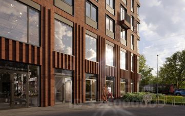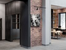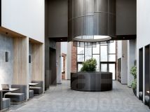 Единая дизайн-концепция продолжается в лобби дома. Сочетание тёплого кирпича с холодным металлом и стеклом создаёт харизматичное, брутальное настроение интерьера парадной группы. Чёткость вертикальных объёмов смягчается округлыми формами стойки ресепшн и декоративных куртин, а большие витражные окна создают иллюзию бесконечности пространства.