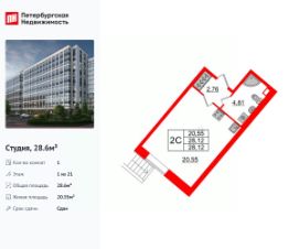 Удобная, классическая, функциональная европланировка, вместительная прихожая 2.76 м². Общая площадь студии - 28.6 м², жилая 20.55 м², высота потолка 2.77 м.