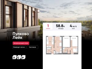 Продается 1-комнатная квартира в ЖК "Пулково Лейк" на 4 этаже. Общая площадь составляет 58.80 кв. м. Квартира с чистовой отделкой. Особенность планировки - антресольный этаж, дополнительное пространство для отдыха, работы или хранения. Жилой комплекс "Пулково Лейк" располагается по адресу Санкт-Петербург, Московский.