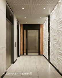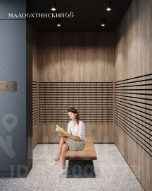 "Малоохтинский, 68" состоит из 16 секций: монолитные дома с остекленными фасадами. Главная входная группа выдержана в европейском стиле с использованием натуральных отделочных материалов. Просторные светлые вестибюли с панорамными окнами, помещение для почтовых ящиков, стойка консьержа, велосипедные и колясочные.