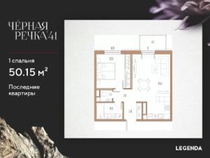 Однокомнатная квартира с предчистовой отделкой в ЖК "Черная Речка, 41" на 9 этаже. Общая площадь: 50.15 кв.м., жилая: 12.83 кв.м., площадь просторной кухни-столовой: 24.75 кв.м. Все окна выходят на одну сторону. В квартире один балкон, один раздельный санузел. Высота потолков 3.0 м.