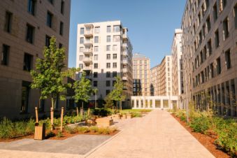 Во дворе комплекса несколько функциональных зон. Здесь предусмотрены детские площадки с канатной дорогой и мягким конструктором, зона для игр и занятий спортом, места для отдыха взрослых, столы для настольных игр и амфитеатр. В ближайшем будущем рядом с комплексом откроется детский сад с бассейном.
