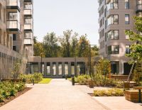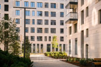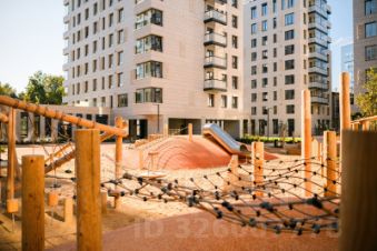 Во дворе комплекса несколько функциональных зон. Здесь предусмотрены детские площадки с канатной дорогой и мягким конструктором, зона для игр и занятий спортом, места для отдыха взрослых, столы для настольных игр и амфитеатр. В ближайшем будущем рядом с комплексом откроется детский сад с бассейном.
