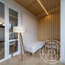 Большая видовая лоджия с теплыми полами, панорамным остеклением (площадь квартиры вместе с ней 66, 5м2). Оконные подоконники выполнены из массива дуба.