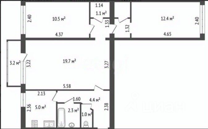 Две изолированные спальни 10.5 м² и 12.4 м² с гардеробными, одна проходная комната 19.7 м², кухня 5 м².