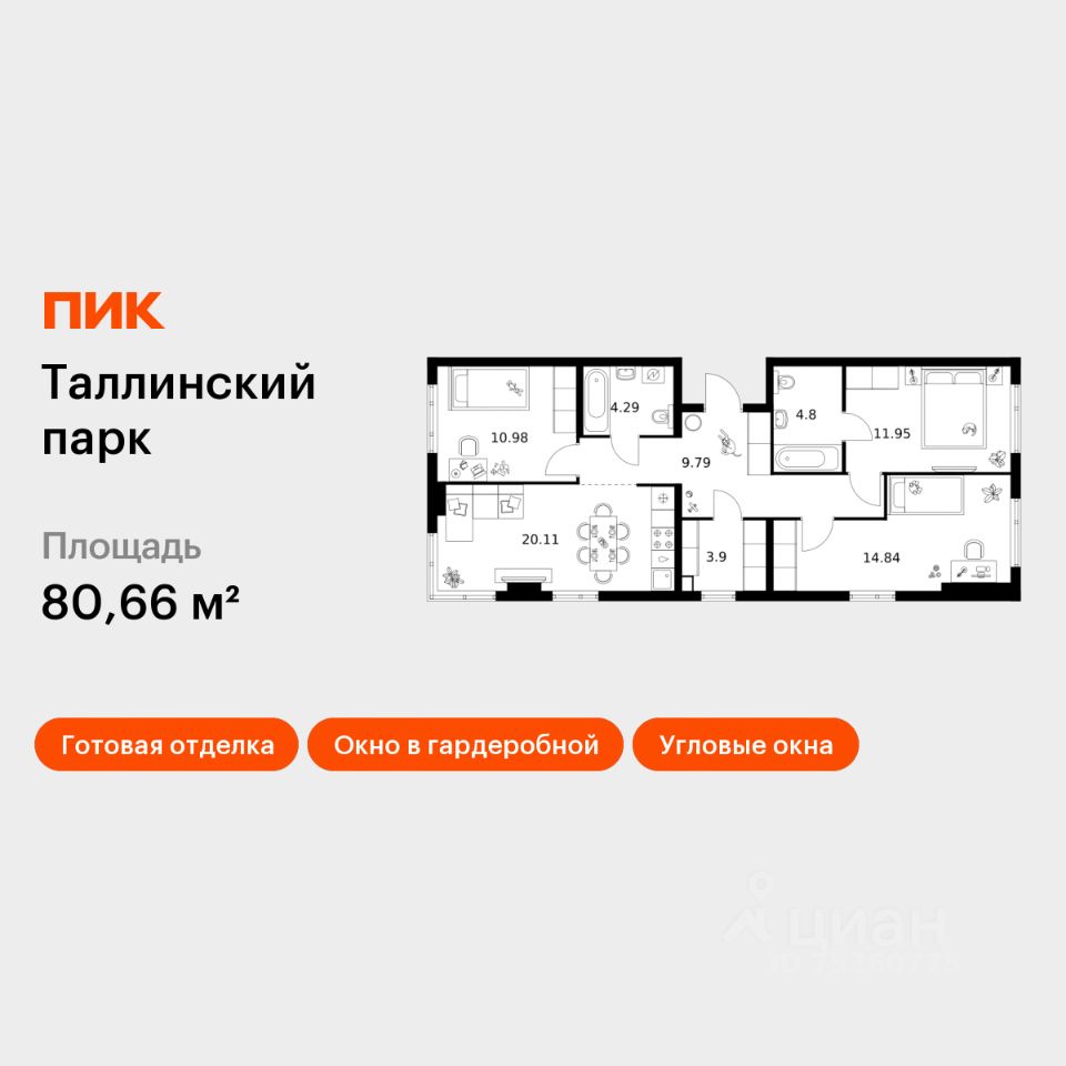 Продаётся 3-комн. квартира площадью 80,66 кв.м на 6 этаже 12 этажного дома (Корпус 4.1, Секция 4) проекта ПИК Таллинский парк. Светлый просторный подъезд на уровне земли, функциональная планировка, большие окна, c отделкой.