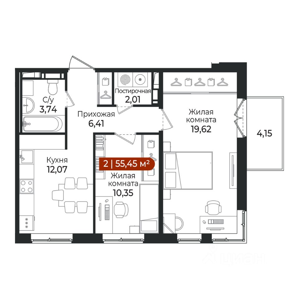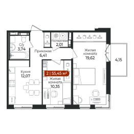 2 - комнатная квартира на 2 этаже общей площадью 55,45 м² в жилом комплексе Арт Парк от застройщика ГК Алгоритм.