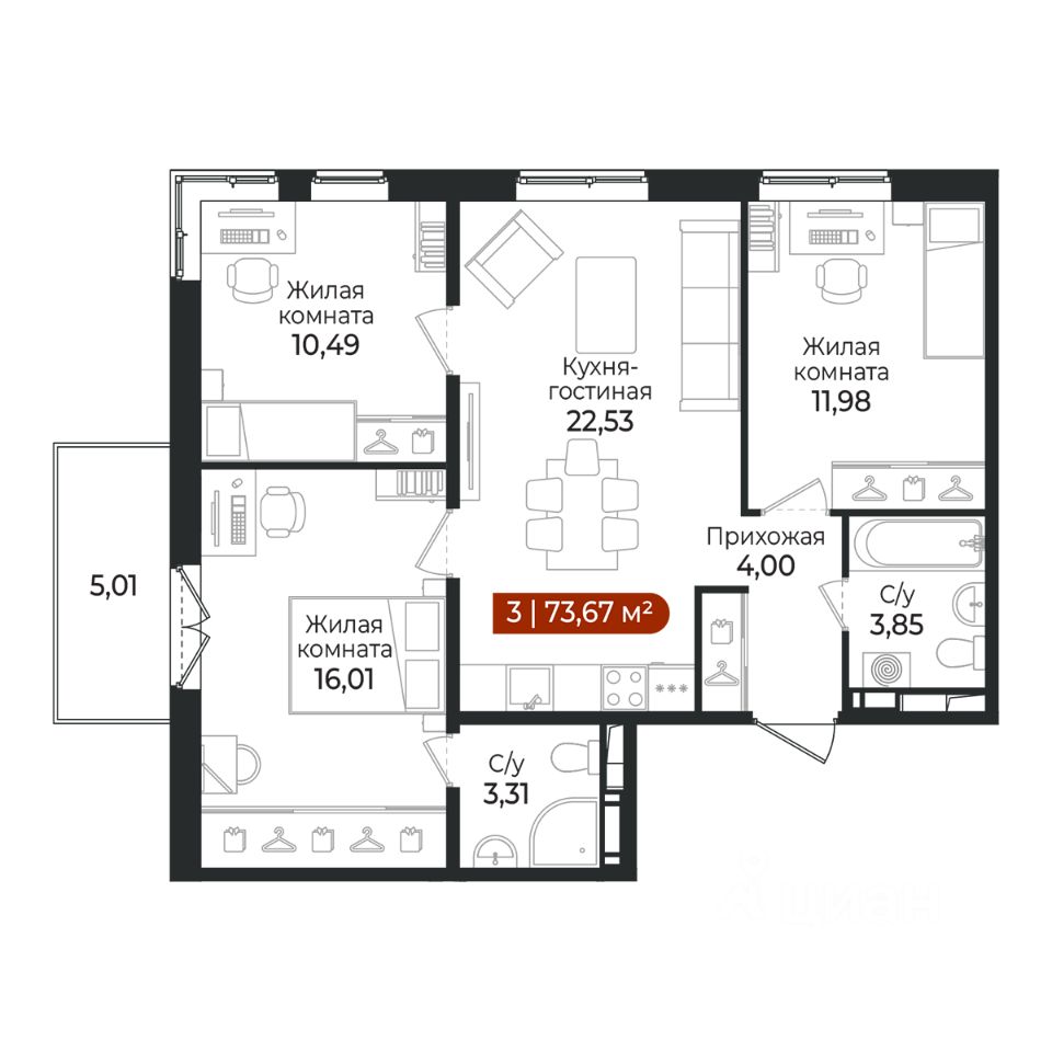 3 - комнатная квартира на 5 этаже общей площадью 73,67 м² в жилом комплексе Арт Парк от застройщика ГК Алгоритм.