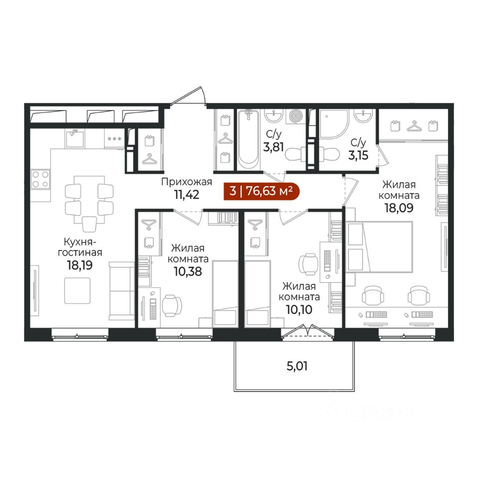 3 - комнатная квартира на 8 этаже общей площадью 76,63 м² в жилом комплексе Арт Парк от застройщика ГК Алгоритм.