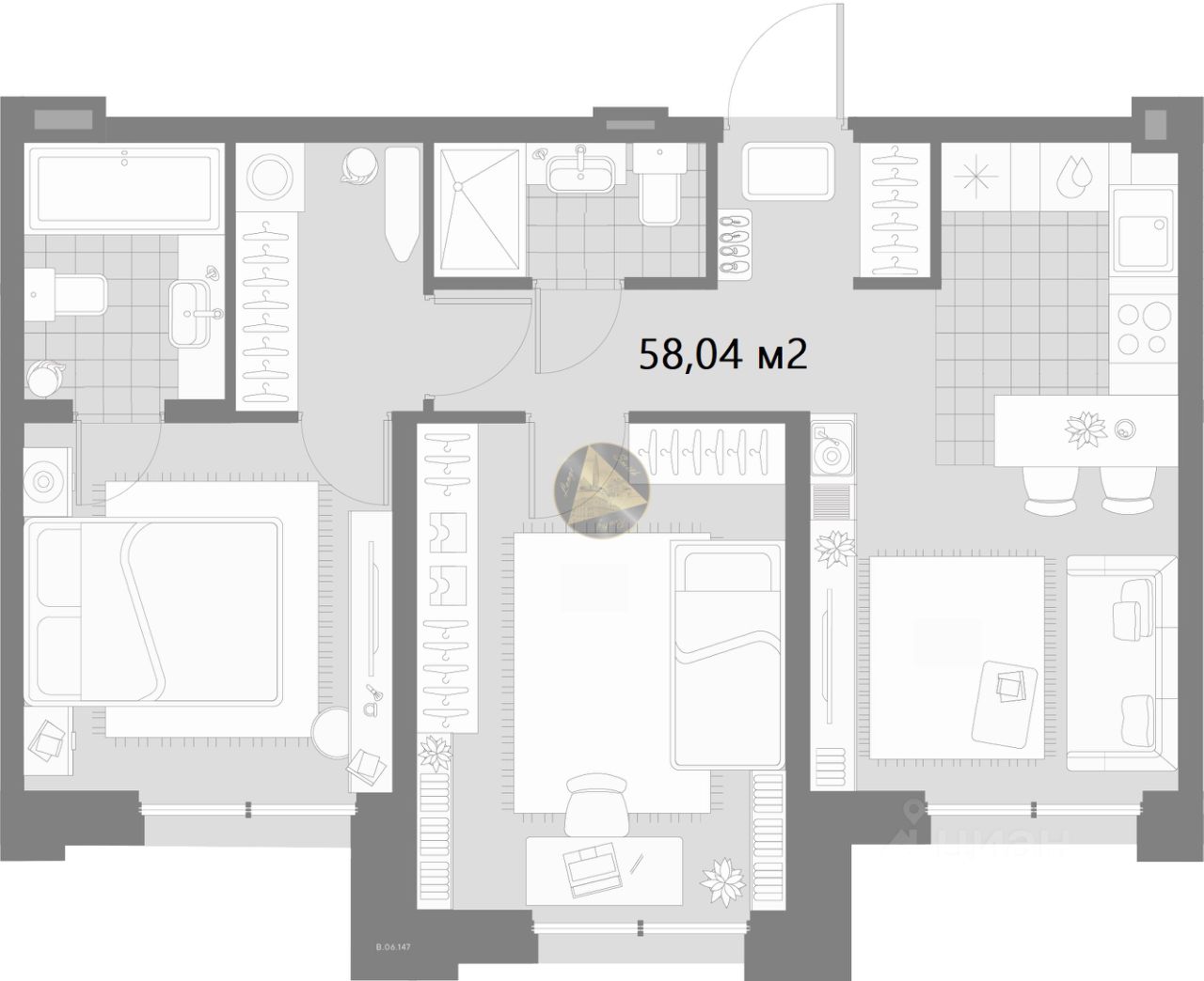 Просторная кухня-гостиная 15,41 м², светлая спальня 9,47 м², уютная детская 12,57 м², гардеробная комната 3,6 м², а также раздельный санузел 3,7 м² + 2,65 м²