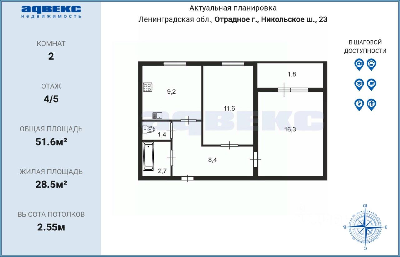 Общая площадь квартиры составляет 51,6 квадратных метров. Планировка включает две комнаты площадью 12 и 16,5 кв.м., кухню площадью 9,5 кв.м., а также раздельный санузел.