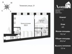 Площадь: 61 м² (фактически 68 м²) евроформат с просторной кухней-гостиной
