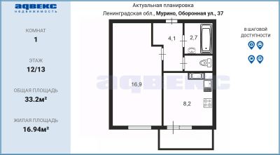 1-комнатная квартира 34 м. с балконом, 12/13 этаж, без ремонта — ваш уникальный шанс!